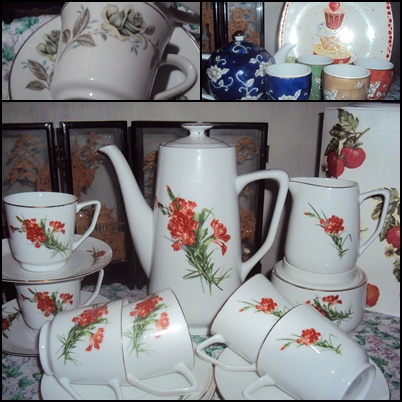 Saya menerima 2pasang cawan bunga ros hitam kekuningan, set teko dan gelas seramik, sebiji pinggan hiasan bercorak cup kek, satu set lengkap cawan bunga carnation oren dan satu set lengkap cawan bunga biru..selepas ini saya perlu mencari penempatan baru untuk semua koleksi ini..